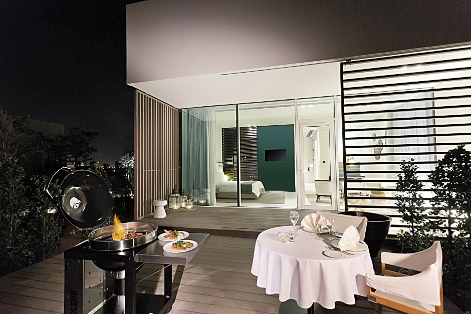 Deluxe Suite with Private Terrace is 54 square feet and includes a double bed 131-150 width plus terrace, satellite tv , cable tv, hairdryer, tea and coffee making facilities , safe, bathrobes, and slippers and is Wheelchair-accessible.